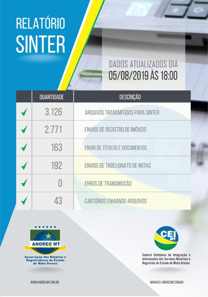 A Associação dos Notários e Registradores do Estado de Mato Grosso (Anoreg-MT) informa que 43 cartórios já iniciaram os envios de documentos relativos a registros de imóveis e tabelionatos de notas ao Sinter.