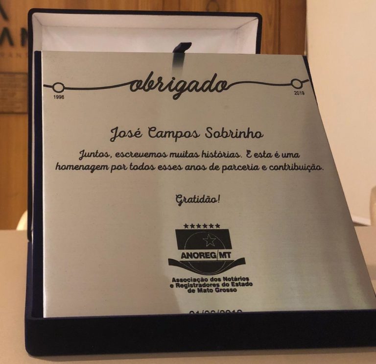 A Associação dos Notários e Registradores do Estado de Mato Grosso (Anoreg-MT) homenageou na tarde deste sábado (1º de junho) o registrador do 1º Ofício de Nova Xavantina, José Campos Sobrinho, pelos relevantes serviços prestados. A solenidade ocorreu durante o V Encontro Regional de notários e registradores, em Sinop.