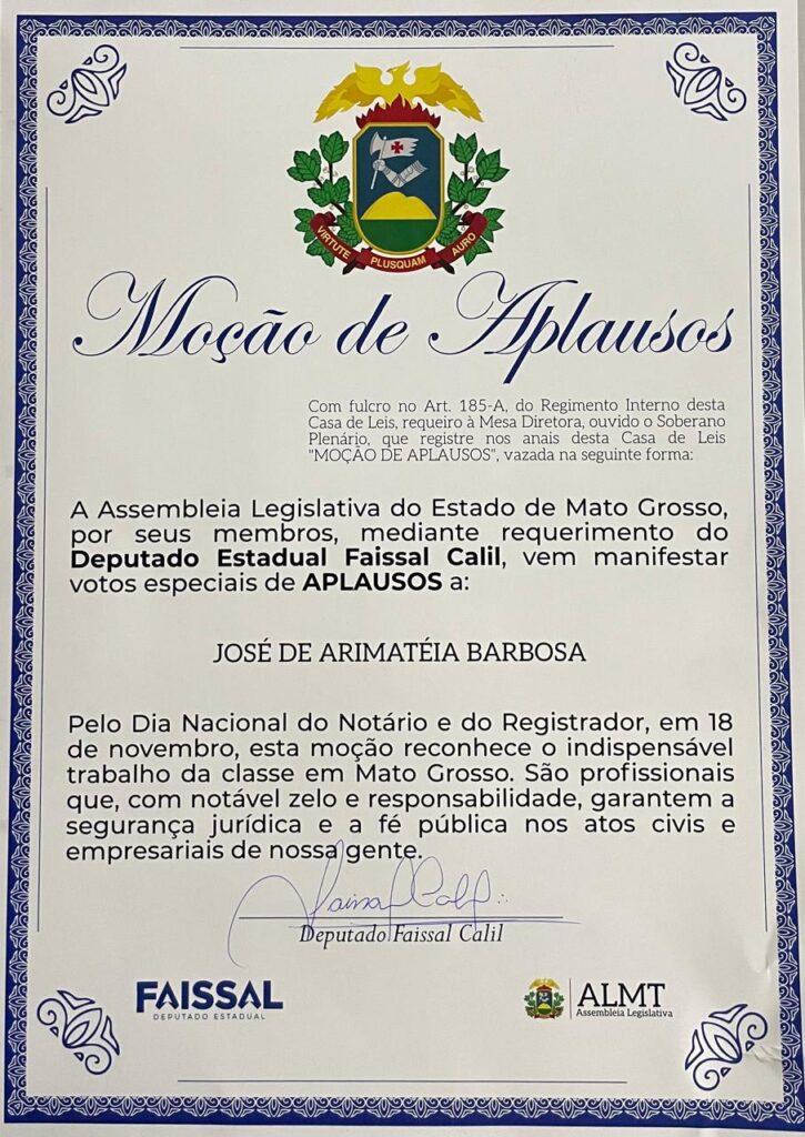 O Cartório parabeniza o Sr. José de Arimatéia Barbosa por essa justa homenagem, que reflete o reconhecimento público de sua trajetória exemplar e do compromisso com a excelência na prestação dos serviços registrais em Mato Grosso.