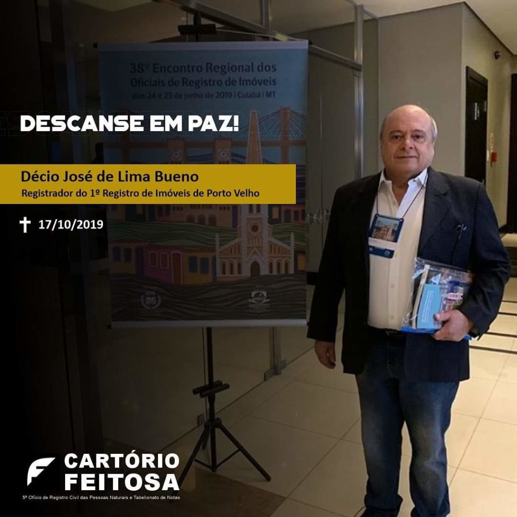 É com pesar que a Associação dos Notários e Registradores do Estado de Mato Grosso (Anoreg-MT) comunica e lamenta o falecimento de Décio José de Lima Bueno, registrador do 1º Registro de Imóveis de Porto Vellho, ocorrido nesta quinta-feira (17 de outubro), naquela cidade.