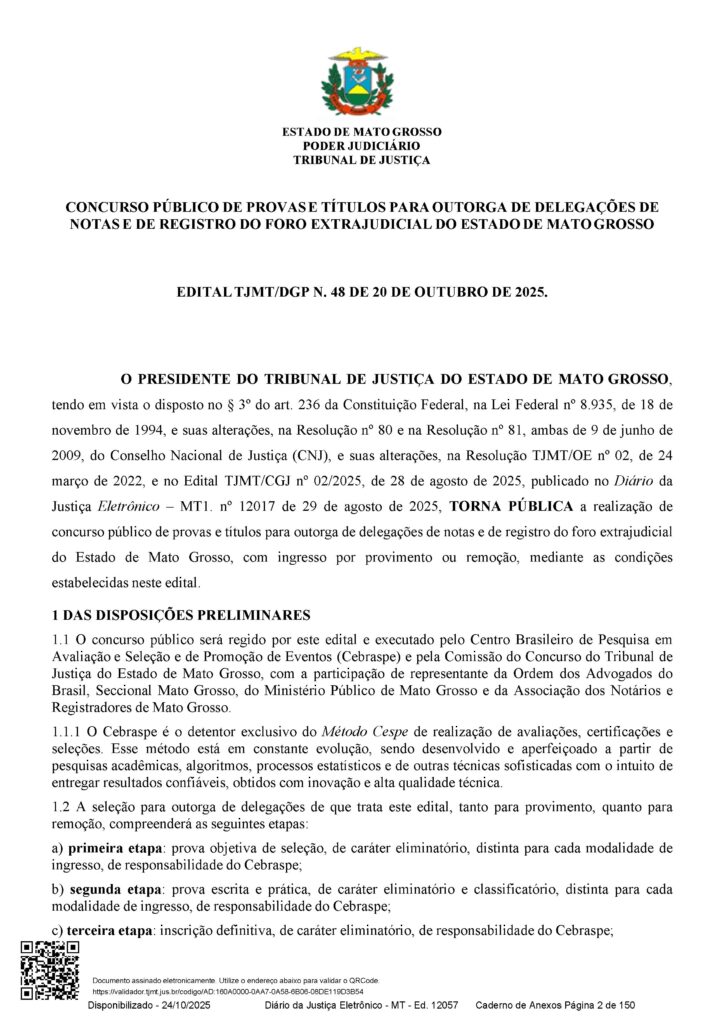 O Tribunal de Justiça do Estado de Mato Grosso (TJMT) publicou o Edital TJMT/DGP nº 48, de 20 de outubro de 2025, que dispõe sobre a realização do Concurso Público de Provas e Títulos para Outorga de Delegações de Notas e de Registro do Foro Extrajudicial em todo o Estado.