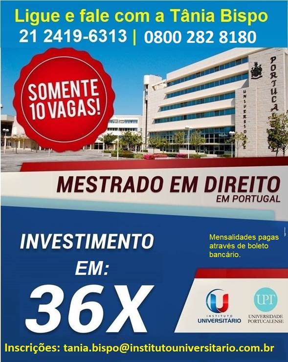 O Instituto Universitário do Rio de Janeiro (IURJ) informa que restam poucas vagas para inscrições no mestrado em Ciências Jurídicas e Políticas para início no primeiro semestre de 2021, na UPT de Porto, em Portugal. Entidades parceiras contam com desconto de 15% até o dia 15 de setembro.